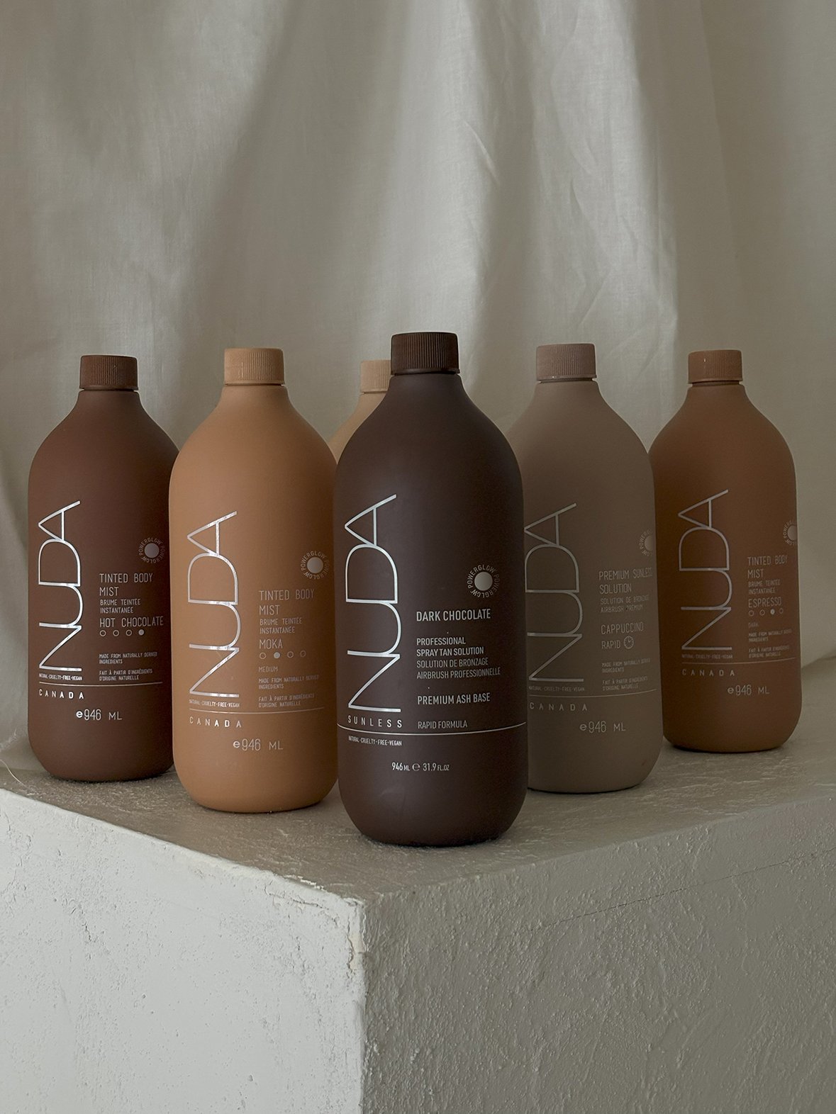 Nuda is a Canadian made professional spray tan brand formulated with high quality, skin loving ingredients. The solution is lightweight, fast drying, and designed to fade evenly without patchiness.